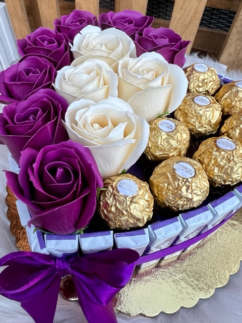 Big mýdlové růžičky fialová + krémová, tyčinky Milka Milkinis, Ferrero Rocher.